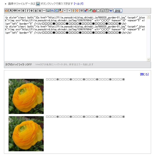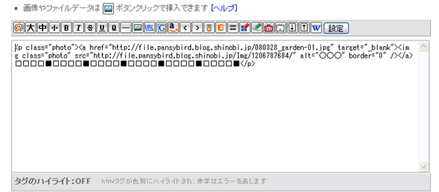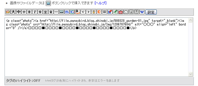 ワタシの利用している忍者ブログには、[ソース]というボタンがありまして、タグを書き込みたい場合にはそのボタンを押してから書き込む仕組みになっていますが、FC2の画面は、タグがわかる方はタグをそのまま記事を書くスペースに書き込んでもよい仕組みになっています。