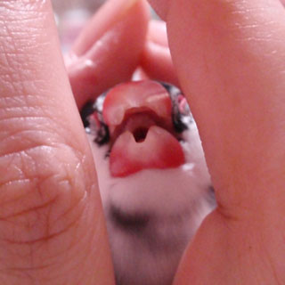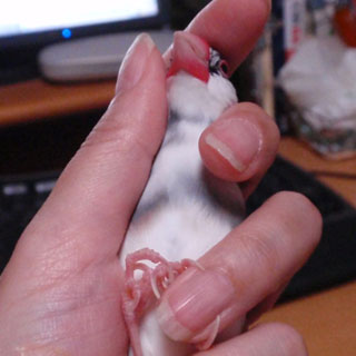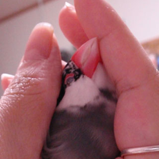 さて、以前、みなさんに禁断の扉を開けていただいた「正しい文鳥のにほひのかぎ方」ですが、今回は「正しい文鳥の握られ方」をお送りします(笑)。