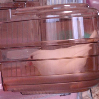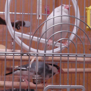 この写真の鏡付きエサ入れ(マユルドさん宅のモッチャンとアラレちゃんが使ってますね!)もそのとっておきのスペースのひとつだったのですが、な、なんと、ある日突然、「彼女」がこの場所に現れたのです(爆)。