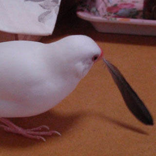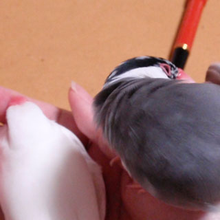 それにしても、白文鳥が桜文鳥の黒い羽を振り回す姿は、やはりちょっと似合わないですね(汗)。