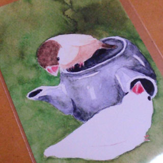文鳥を題材にしている時点で、多分、少なくとも文鳥バカである可能性は高いのですが(笑)、お急須で暖を取っている姿を描くのは、そうとうの文鳥バカ(失礼!)だと拝察した次第でして(汗)。