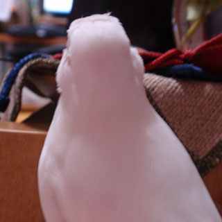 くちばしの色もアイリングの色も冴えなくて、しかも、白文鳥は羽が抜けると肌が透けるので、ついつい心配で甘やかしてしまうのですが、本人は至って好調のようで、頭の羽が乱れていても探検にも余念がありません。