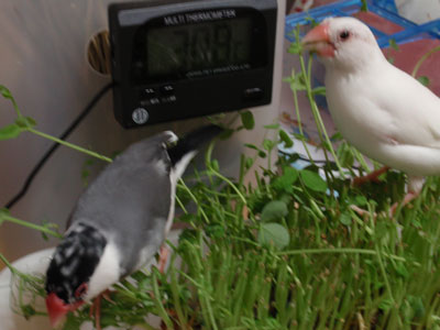 そんなワタシの心配をよそに、例によって例のごとく、豆苗畑で好き放題の文鳥連中。