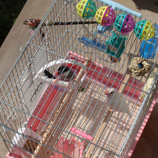 一方のチビッコ・桜は…といえば、何か音がする度にカゴの中で飛び回り、ブランコに乗っては無表情に揺られ、助けを求めるような目でワタシを見てました(笑)。