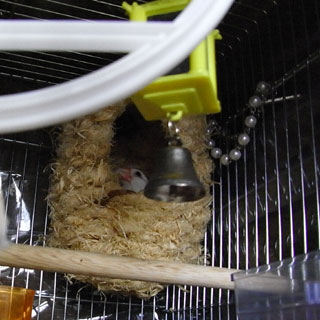 一生懸命抱卵している「彼女」ですが、カゴの外でチビッコ・桜におやつをあげていると、どうやってかぎつけるのか、巣から乗り出して様子をうかがいます。