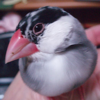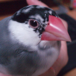 正面から写真を撮らせてくれるとよくわかるのですが、首を曲げるのが大好きな我が家の文鳥連中、なかなか正面からの写真は難しいので、左右それぞれに激写してみました。