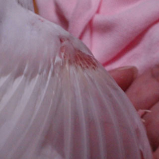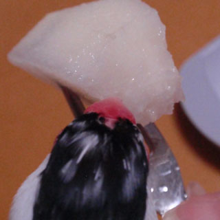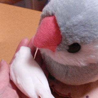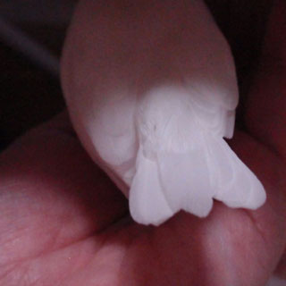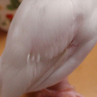 いつも小雪の換羽のときに思うのですが、白文鳥は地肌が透けてみえるだけに、とても寒そうで、気の毒な姿に見え、ついつい部分的なアップ写真を撮ってしまうのです(爆)