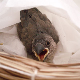 最初は、フゴに入ってたから、姿を見ることはなかったんだけど、最近、少し飛べるようになったらしくて、お腹がすくと大騒ぎして、小さなカゴから飛び出してくるのよ。