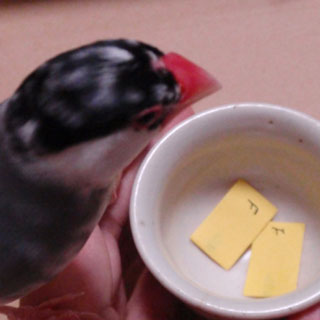 えぇ、何せ、「寝逃げの吹雪」と文鳥界のごくごく一部で有名な吹雪が抽選をしますので、飼い主、いろいろと工夫をして、なんとか抽選してもらおうと試してみましたともっ!